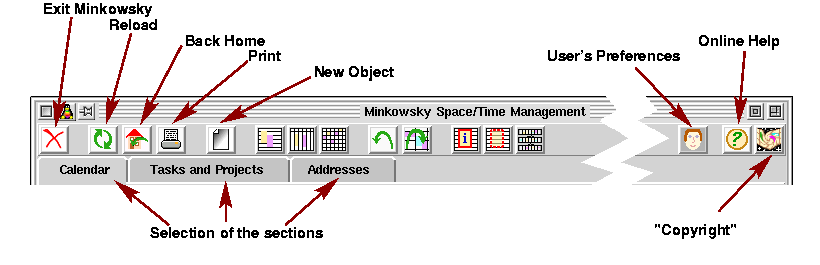 IntroductionMinkowsky is a client server application. Therefore all data are stored on a central server. The clients request and display this data (and send changes to the server) The server itself maintains basically one huge calendar, one huge list of tasks and projects and one huge address book. A users calendar is now only an excerpt of all appointments the particular user participates. However, it is possible to take a look into other users calender (list of tasks and so on). A system of permission controls which appointments (tasks, ...) of one user is visible to another. This permission can be either based on settings inn an appointment ( task ...) or in the users preferences. Minkowsky manages groups of user (similar to the OS). The members of the groups are determined by the administrator on the server. This groups may give either an faster access to departments within your organisation. And you may assign special permission to groups. Command line optionsIf you start Minkowsky from the command line you have some options: